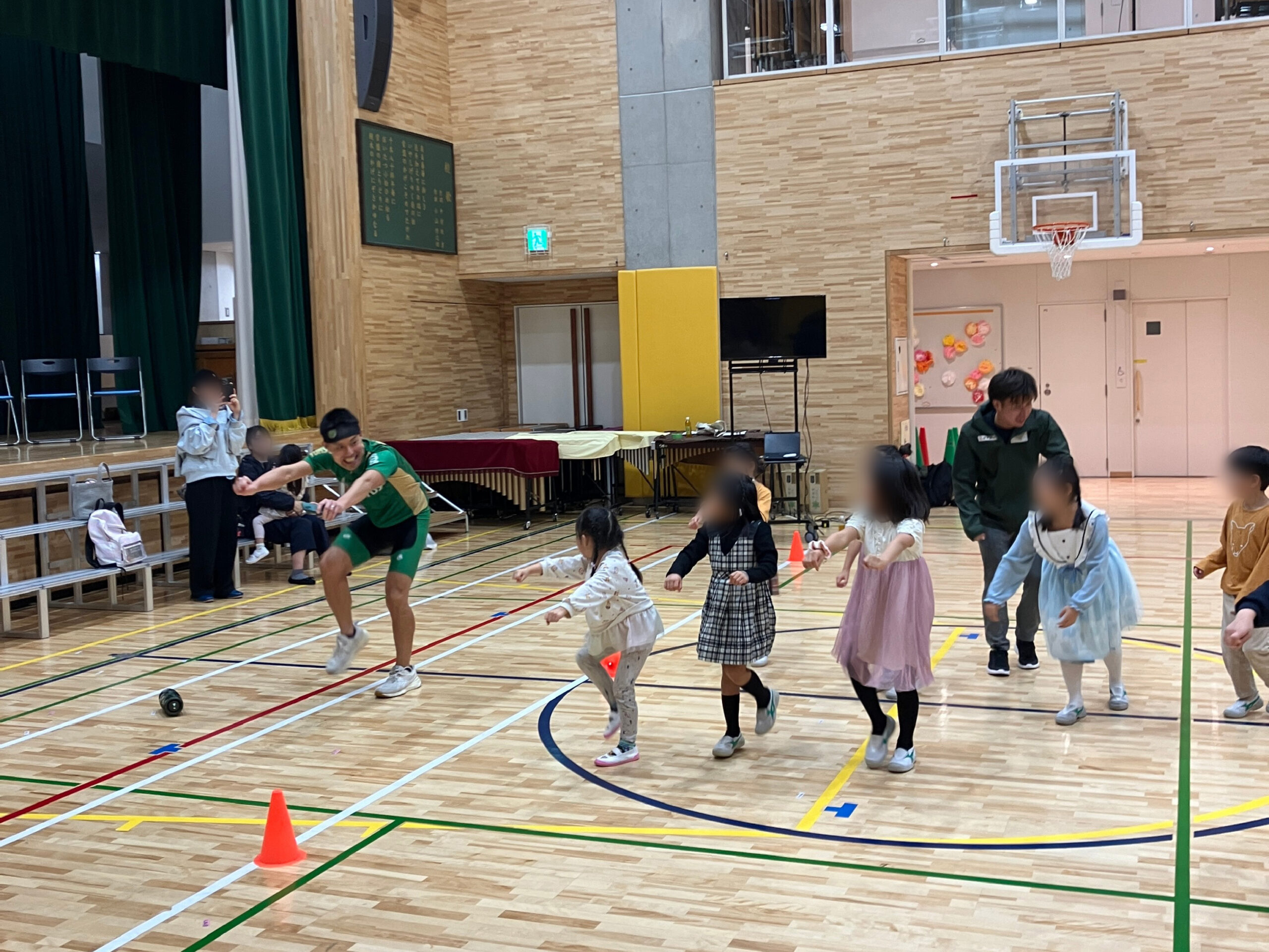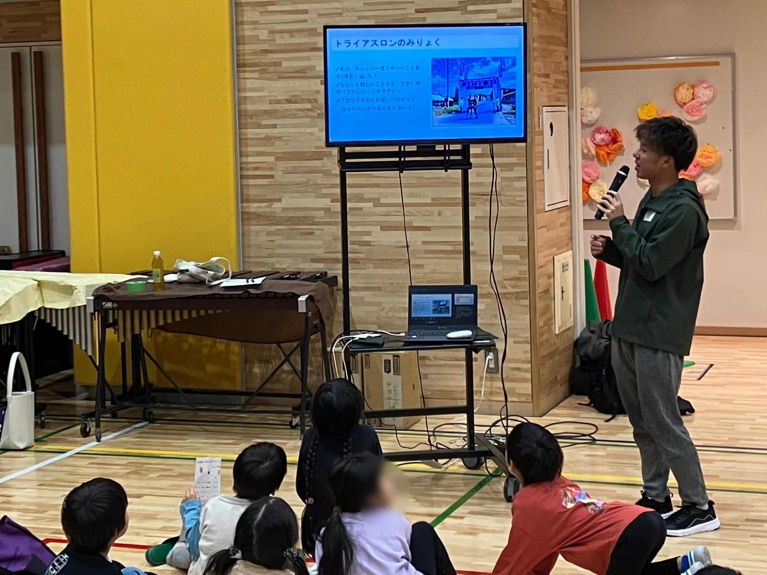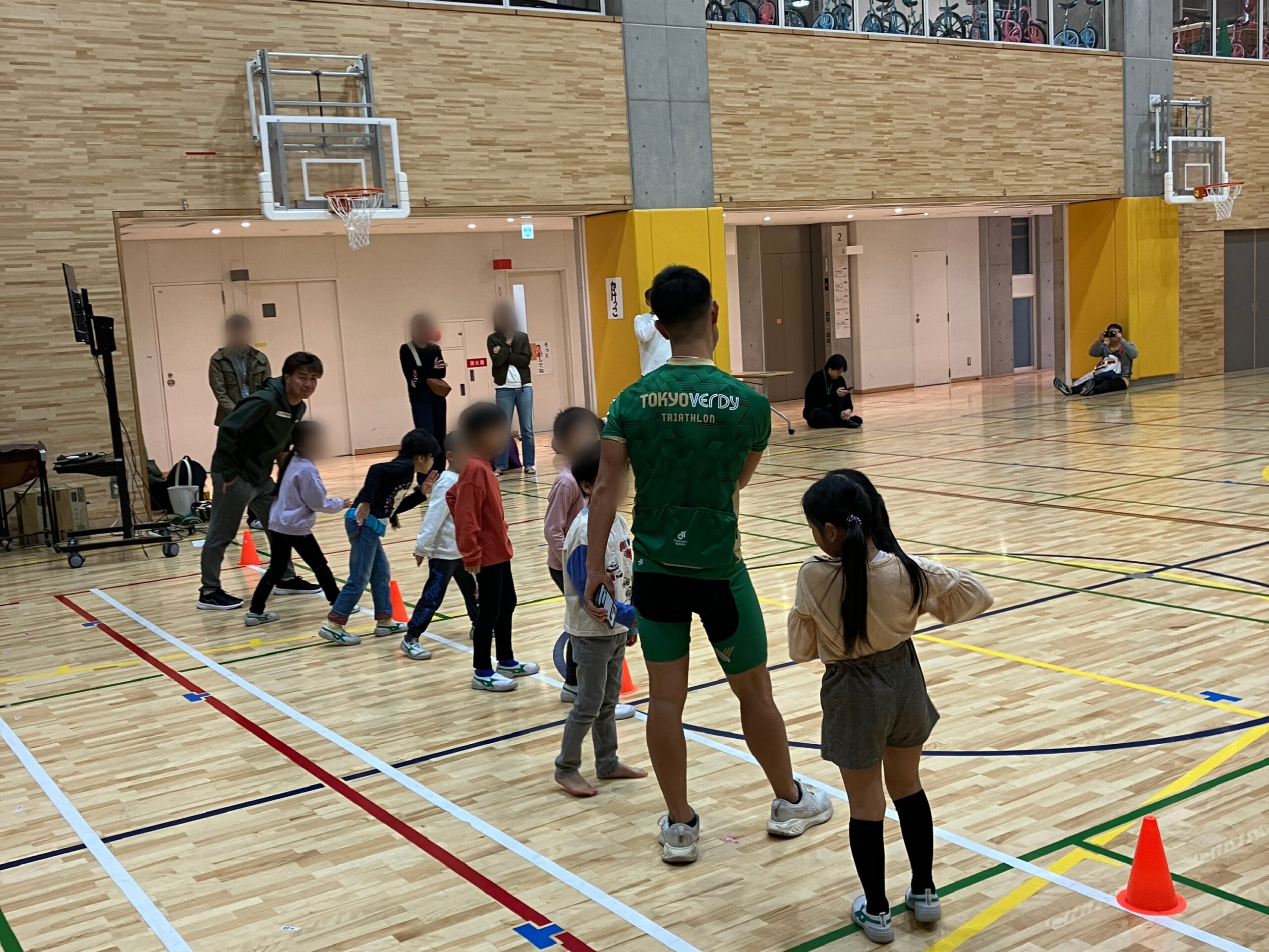 当日は、当社所属のトライアスロン選手である山本稜弥が「かけっこ教室」を担当し、ただ速く走るだけでなく、走る動作の楽しさや身体の使い方を、子どもたち一人ひとりに伝え、トライアスロンの競技の魅力も紹介しながら、参加した子どもたちと共に汗を流しました。